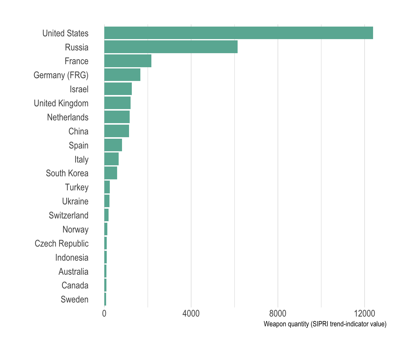 Here is an example showing the quantity of weapons exported by the top 20 largest exporters in 2017 (more info here):